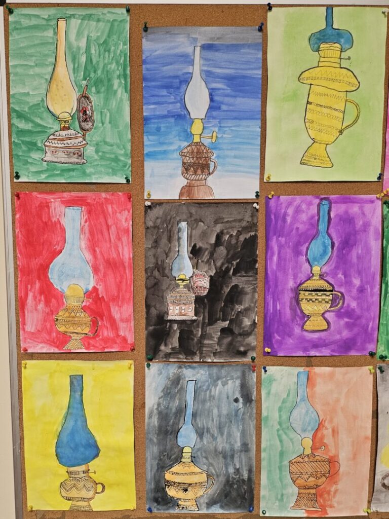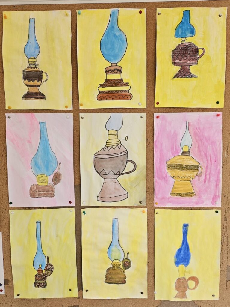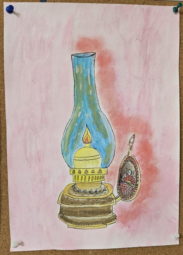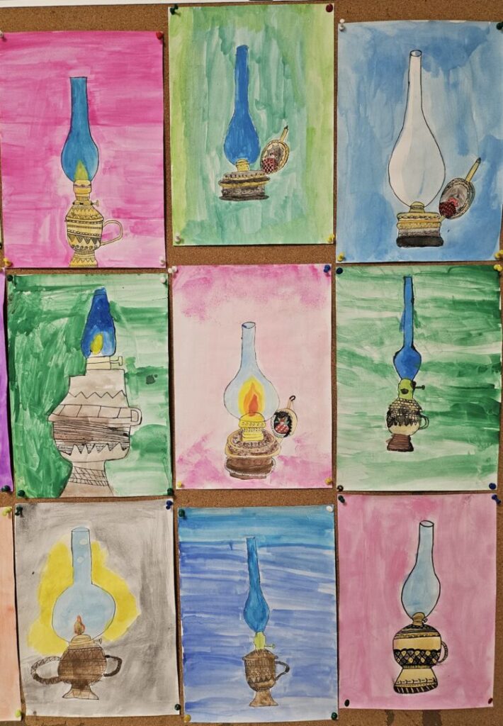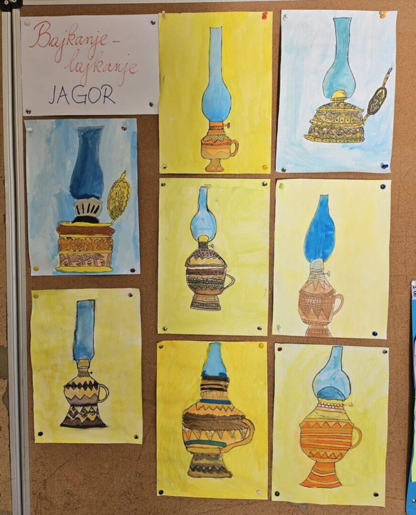 Sljedećih dana smo se po razredima bavili još uvijek navedenom bajkom, ali na likovnoj kulturi gdje smo tušem i vodenim bojama slikali uljanu lampu koja se u bajci spominje kao izvor svjetlosti u noćnim satima u ta davna doba.