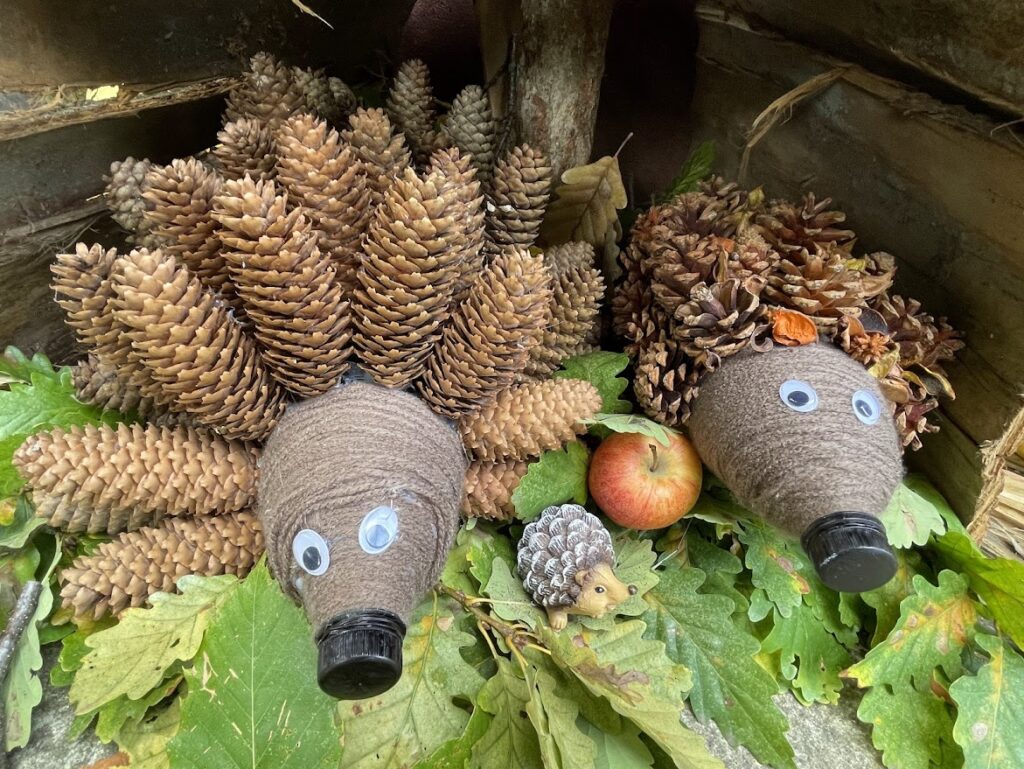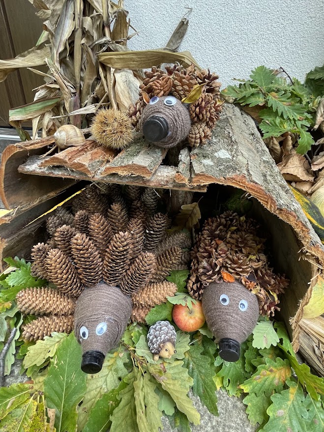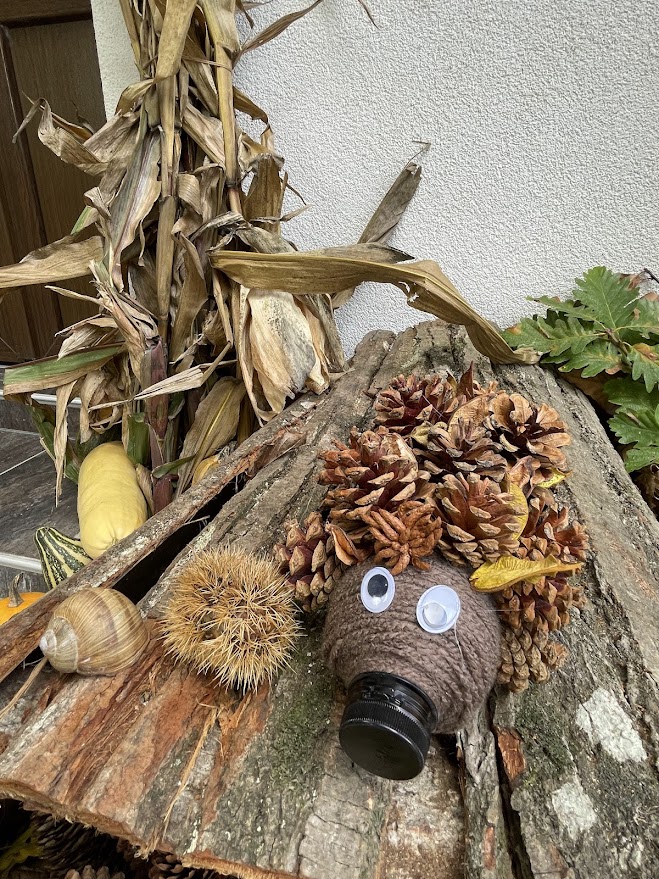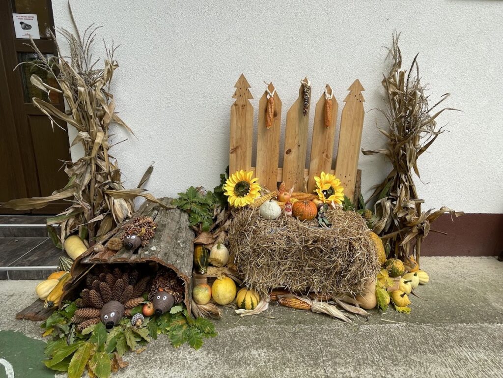 Jesen je stigla i u našu školu! Uredili smo ulaz škole u toplim jesenskim bojama i mirisima prirode. Od češera, starih boca i vune izradili smo veselu obitelj Ježurke Ježića – mamu, tatu i dva mala ježića. Prostor smo ukrasili bundevama, kukuruzima i raznim jesenskim plodovima, stvarajući pravi mali jesenski kutak.