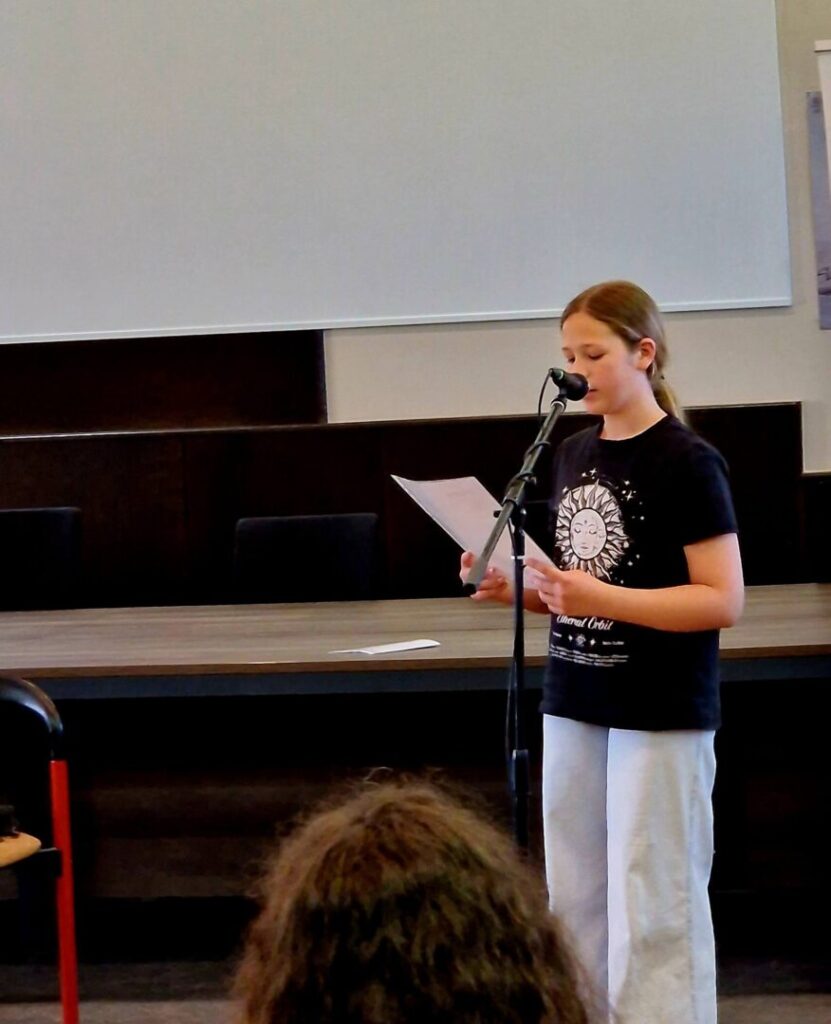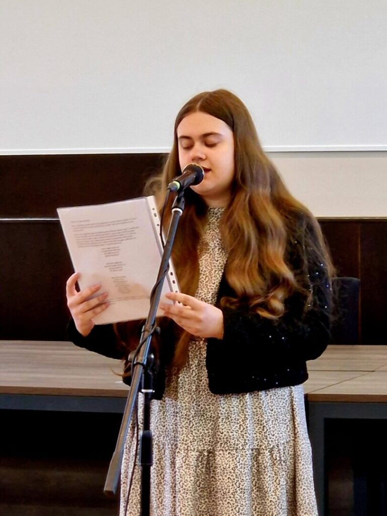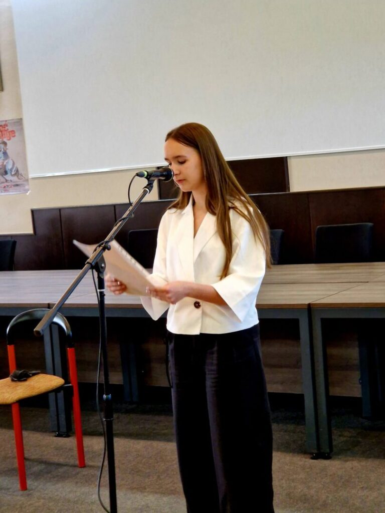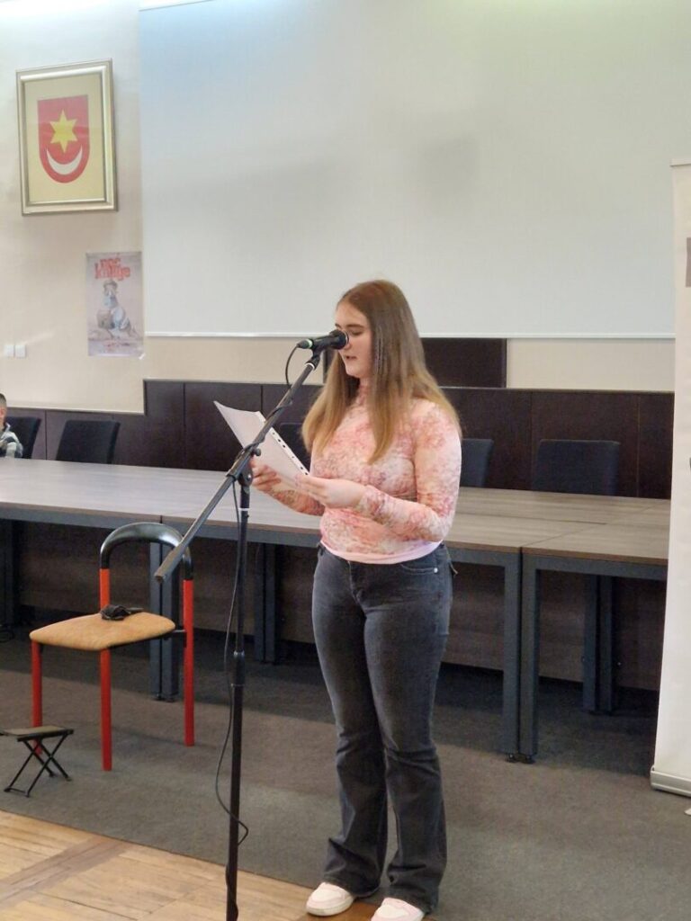 Učenice naše škole Paula Nikić, Katarina Sever, Helena Majcug, Ivona Majcug i Tamara Čehulić lijepo su izražajno pročitale pjesme dobro nam poznatih hrvatskih pjesnika Dobriše Cesarića, Dragutina Tadijanovića, Antuna Branka Šimića te Tina Ujevića. Poseban dojam na sve okupljene, kojih je bilo stotinjak, ostavila je učenica 8.b razreda Tamara Čehulić, čija je interpretacija naslovne pjesme recitala „Pobratimstvo lica u svemiru“ bila snažna i vrlo dirljiva.
