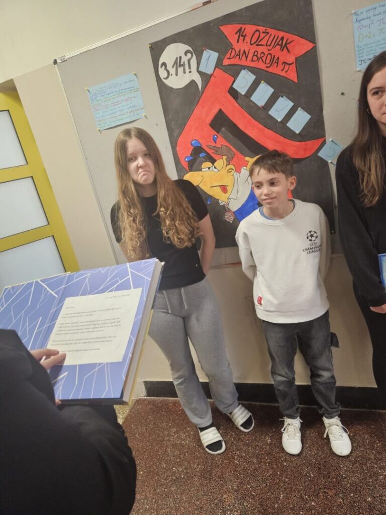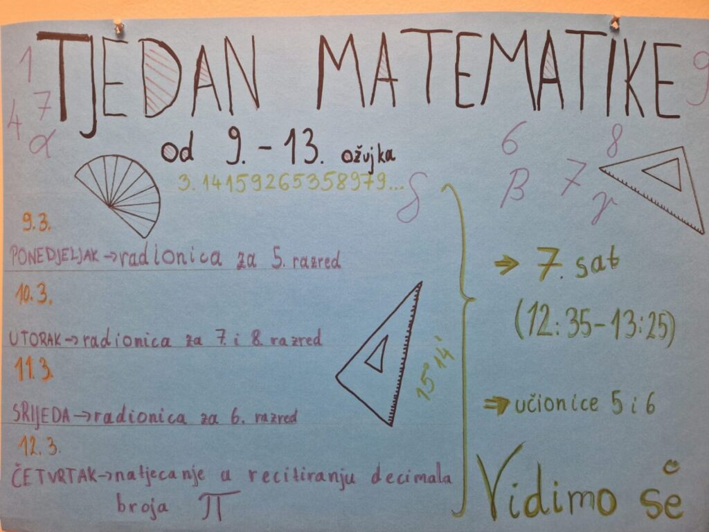 Tjedan je završen u četvrtak, kada smo zajednički proslavili Dan broja π. U natjecanju u recitiranju decimala broja π učenici su pokazali iznimno pamćenje, koncentraciju i hrabrost, a cijeli događaj protekao je u veselom i poticajnom ozračju.