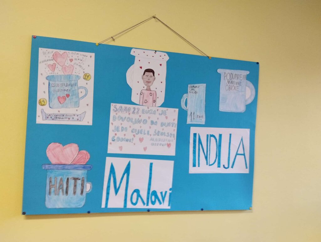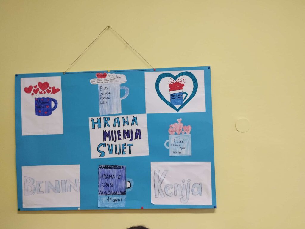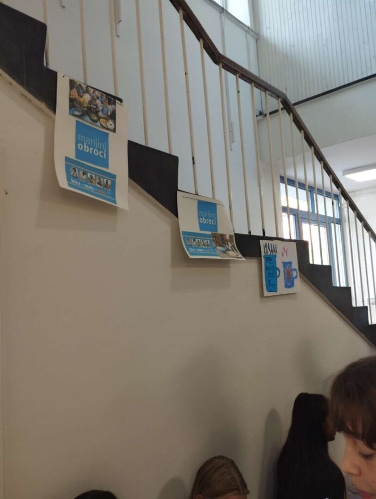 Učenicima smo predstavili rad organizacije Marijinih obroka. Učenici Vjeronaučne grupe sa svojom vjeroučiteljicom Marinom izradili su plakate koje su postavili u školskoj kuhinji i time nam posvješćivali zahvalnost za ono što imamo i potrebu da dijelimo s onima koji nemaju.